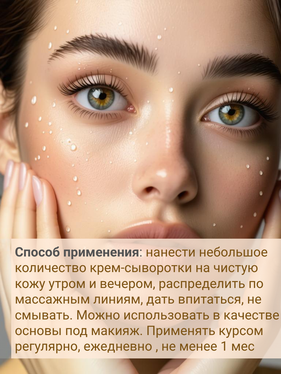 Способ применения: нанести небольшое количество крем-сыворотки на очищенную кожу утром и вечером, распределить  по массажным линиям, дать впитаться, оставить без смывания . Можно использовать в качестве основы под макияж. Применять курсом ежедневно, регулярно не менее  1-3 месяца.