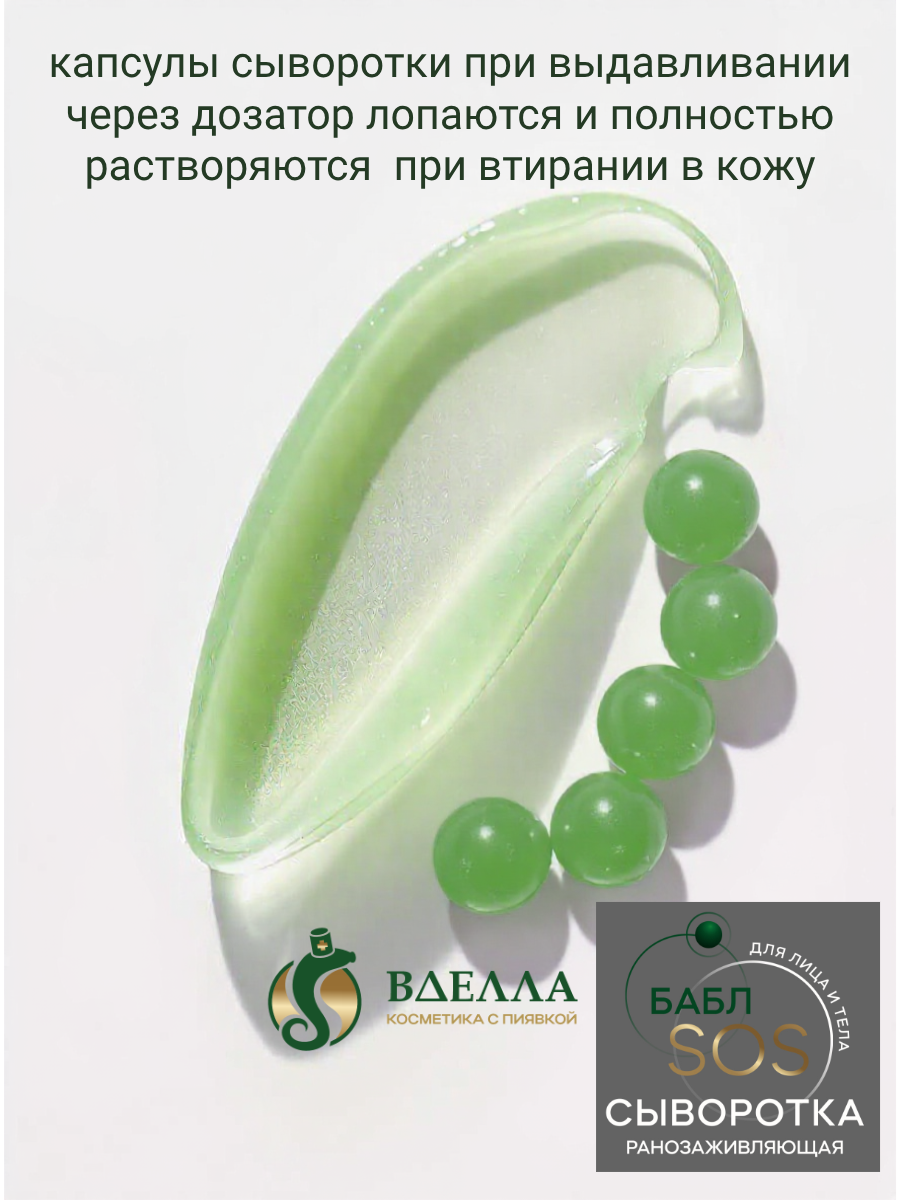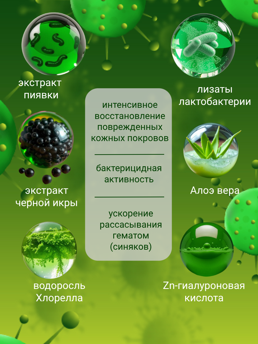 Сыворотка для лица и тела с экстрактом медицинской пиявки, черной икры, Zn -гиалуроновой кислотой, инкапсулированной водорослью Хлорелла в сферах, лизатом лактобактерий, Алоэ вера. Интенсивно восстанавливает поврежденные кожные покровы, обладает бактерицидной активностью, ускоряет рассасывание гематом(синяков).